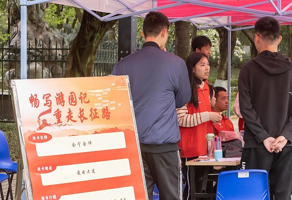 张毅广场前,同学们在倒计时内,对时间纸条和事件纸条迅速地进行匹配,让大家仿佛身临其境,真切感受着长征出发时的紧张不安,突破国民党封锁线的艰难险阻。转战金瓯广场,同学们小心翼翼地将球吹至终点,在失败与调整中不断摸索,宛若穿越时空,见证着当年中央红军反复渡河,摆脱追兵的奇迹。西区体育场内,通过指压板模拟金沙江上的“渡江船只”,同学们不畏困苦,抵达对岸,理解了长征路上巧渡江河的艰险,以及先烈们不畏牺牲的滚烫初心。来到石碾广场后,同学们在平衡木上行走并完成套圈活动,培养了面对挑战时的勇气、毅力和冷静,映射着红军在长征途中勇往直前、不畏艰险的精神。在金鹰广场前,面对一个个随机的题目卡片,同学们迅速调动起平日的知识储备,准确无误地说出答案。经过一个多小时的长征,同学们在凌云大道胜利会师,接力作画,猜测长征中的历史事件。这考验着大家的默契程度,加深了同学们对长征的认识,也促进了彼此间团结协作。回望万里长征路,传承红色精神,赓续先辈意志,是吾辈需要牢牢铭记与亲力实践的时代责任与使命。